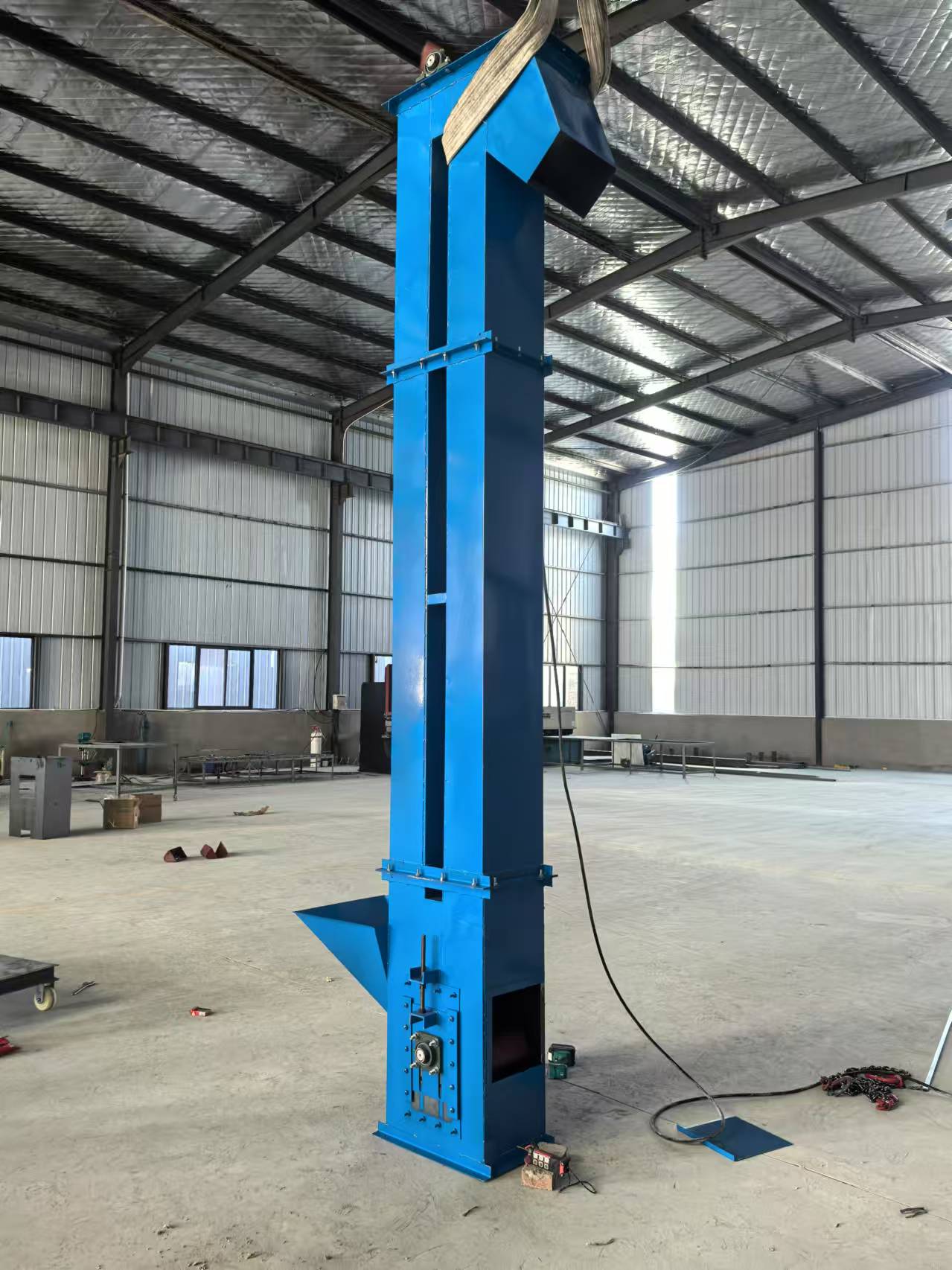 2. 工作原理:一般通过电动机驱动,利用连续运转的带有铲斗(或皮带、链条)的装置来抓取并运送物料。物料被装入位于底部的进料口后,随着设备的运转而上升,*终从顶部的出料口排出。