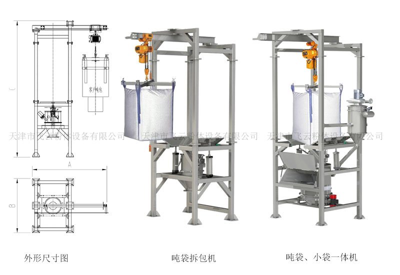 拆包机由夹袋机构、电动葫芦、吨袋吊架、自动气缸拍打装置或震动装置、吸尘器、设备支架等组成,整套结构设计合理,操作方便,密闭式开袋,改善工作环境,下料完全,残留料少。