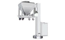 该机主要由底盘、立柱、提升系统等部件组成。工作时,先将装有物料的料斗推入料斗提升机的提升叉架上,然后启动提升按钮,料斗做提升运动,料斗到位后转动底盘与加料的设备密闭对接,开启出料蝶阀,使物料密闭转移到下一工序。