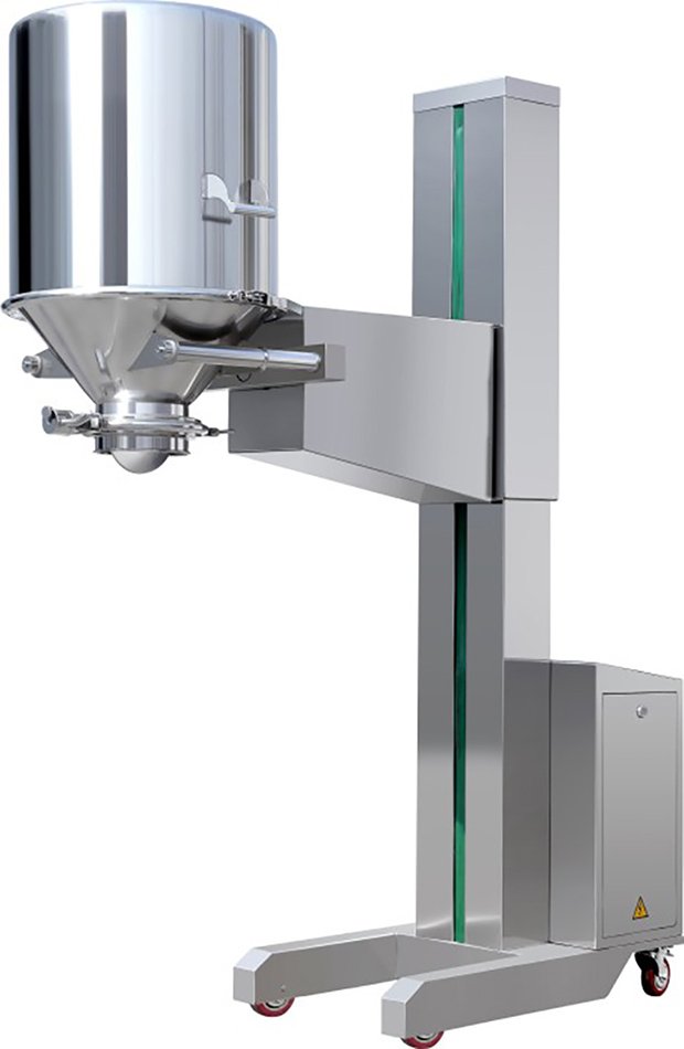 该机主要由底盘小车、伸缩系统、提升系统、翻转系统等组成。工作时,先将锥斗与料桶扣合,然后启动提升按钮,料桶提升;启动翻转按钮,料桶即可翻转180° 移动底盘小车与加料的设备密闭对接,开启出料蝶阀,使物料密闭转移到下一工序。