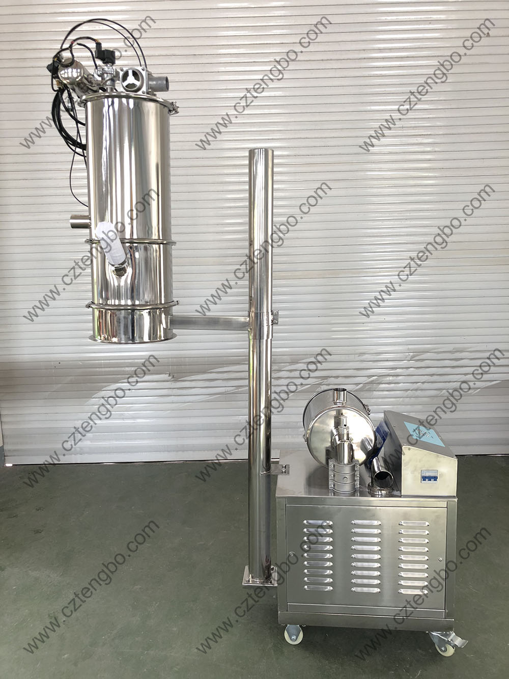 真空料斗由真空料斗本体、过滤器(有聚酯覆膜过滤器、PE过滤器、316L不锈钢过滤器或钛金属过滤器多种选择)、压缩空气反吹装置、气动放料门装置、料位自动控制装置、不锈钢吸料咀、输送软管等组成,整套系统设计合理、制造精美。与真空加料机本体规格尺寸一致,为单一料气分离单元,无动力总成.