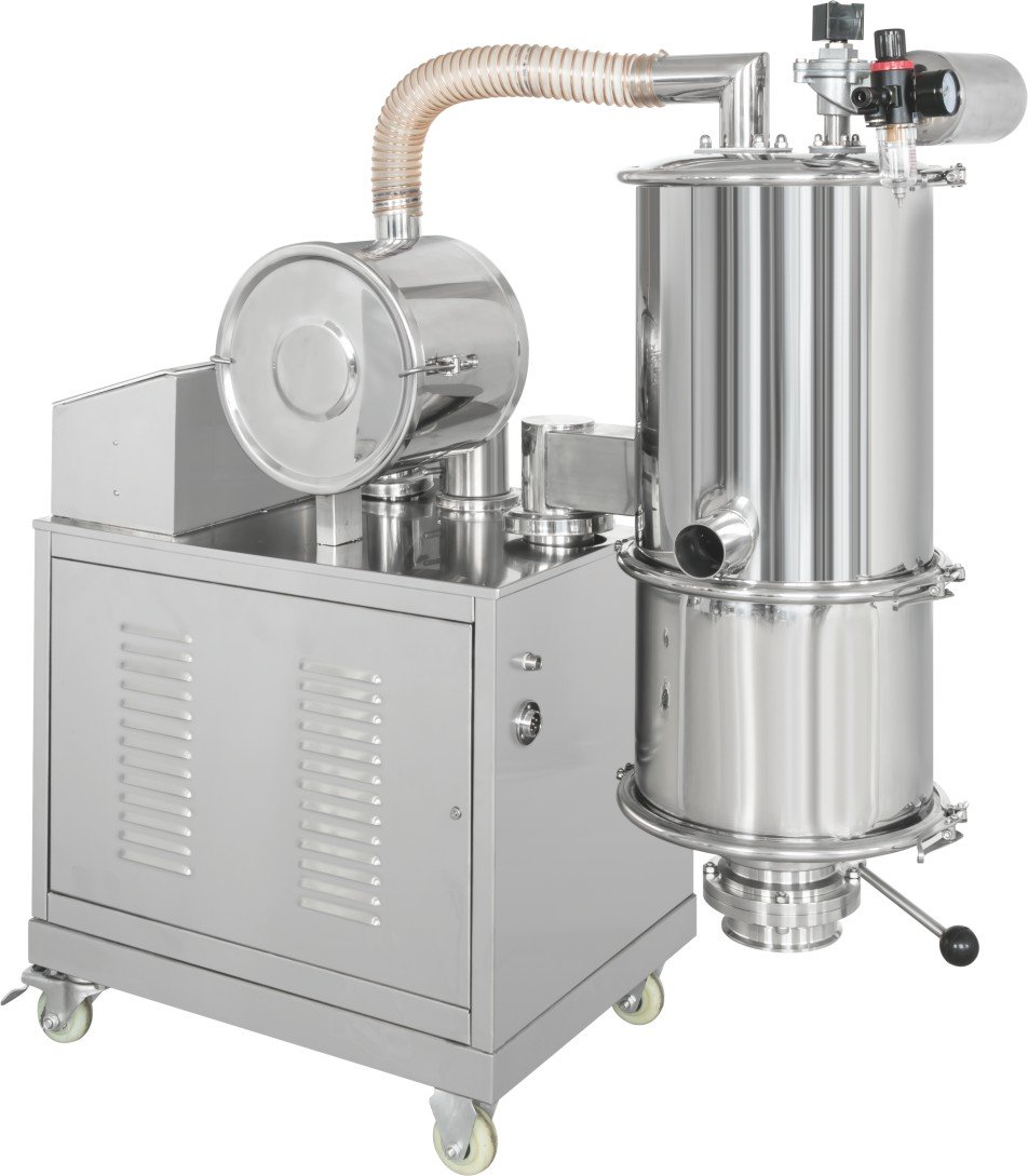 真空上料机是一种粉状料、粒状料、粉粒料混合料的真空输送设备。真空加料机能自动地将各种物料输送到料仓、包装机、注塑机、粉碎机等设备的料斗中,也能直接把混合的物料输送到混合机(如V型混合机、二维混合机、三维混合机等)中,减轻了工人的劳动强度,解决了加料时粉尘外溢等问题,是制药厂、食品厂、促进清洁、文明生产的设备。