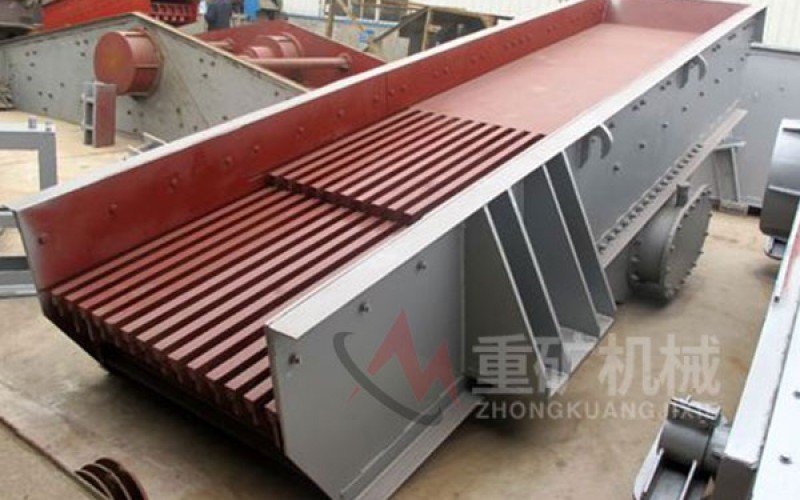 振动给料机主要由机身、弹簧、弹簧底座、激振器、振动电机、筛条组成。电动机经三角带使激振器偏心块产生高速旋转;运转的偏心块产生很大的离心力,激发筛箱产生一定振幅的圆运动,筛上物料在倾斜的筛面上受到筛箱传给的冲量而产生连续的抛掷运动,物料与筛面相遇的过程中使小于筛孔的颗粒透筛,从而实现分级。