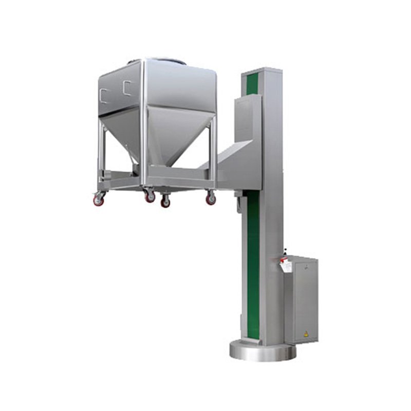 该机主要由底盘、立柱、提升系统等部件组成。工作时,先将装有物料的料斗推入料斗提升机的提升叉架上,然后启动提升按钮,料斗做提升运动,料斗到位后转动底盘与加料的设备密闭对接,开启出料蝶阀,使物料密闭转移到下工序。