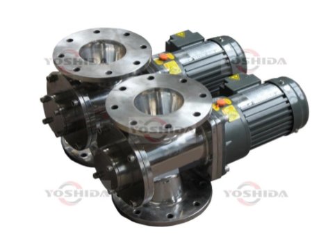 星形给料阀结构是在横向圆柱体内插入由驱动电机带动的旋翼转子,由于重力的作用下通过转子的转动从上部把粉料进入转子腔内,再通过旋转,把腔内的物料旋转至下部出料口处,再由于重力作用下,物料离开转子腔进入设备的下部区域。当转子停止时,停止出料,工作腔的物料将停留在原地。当转子开始运转时,粉料又开始进行定量的出料。设备可以通过改变驱动的转速或腔体的大小来改变粉体的供给速度。