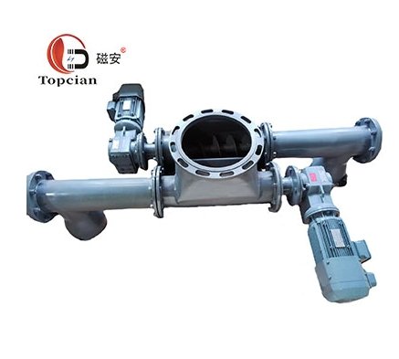 双螺旋给料机由两个类似单管式螺旋给料机组合而成,一般两管螺旋机的螺旋方向相反,在进料段能起到输送和搅拌物料的作用。有特殊要求时,进料口位置可以配备进料调节控制闸门,控制料仓物料对螺旋轴的压力,改善运行工况。