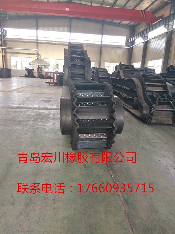为便于绕过滚筒,档边设计成波纹状;横隔板的作用是承托物料,为了实现大倾角输送,采用T型TC型。档边和横隔板是用二次硫化的方法与基带连接的,具有很高的连接强度。用于输送易散落的粉状、粒状、小块状、糊状及液态状物料。其特点:适用于倾角0°~90°散装物料的输送;具有使用范围广、占地面积小、无转运点、减少土建投资、维护费用低、维修容易 输送量大 连续化、高效率、大倾角运输,操作安全,使用简便,,运费低廉,并能缩短运输距离,降低工程造价,节省人力物力等特点;解决了普通带和花纹带所不能达到的输送角度;还可根据使用环境,设计成完整、独立的输送系统,避免了间断输送和复杂输送的提升系统。可沿水平、倾斜、垂直和变角方向输送各种散装物料,从煤、矿石、沙子到化肥和粮食等。物料粒度不限,可从很小的粒度到400mm的大粒度,输送量可从1立方米/小时到6000立方米/小时。