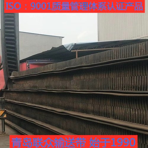 补充说明:强力输送带的强力层为聚酯帆布(EP),具体又分为EP100型、EP150型、EP200型、EP250、EP300型、EP350型、EP400型等;还可以是尼龙帆布(NN),可以分为NN100、NN150、NN200、NN250、NN300、NN350、NN400、NN450、NN500型等。 高倾角带:包括矮花纹带、高花纹带、横隔板式带和挡边式带几类(图3)。矮花纹带的工作面覆盖胶上带有高度在10毫米以下的各种形状橡胶凸块或凸条,以阻挡物料的层移,用来输送粉状和小颗粒的散状物料。高花纹带带面上的凸块高度在10~25毫米间,以阻止物料的翻滚,用来输送中、大粒度的散状物料。这两种带可使输送倾角提高10°左右。横隔板式带的工作面覆盖胶上粘有高100多毫米的隔板,隔板的形状分为双鳍形、多鳍形、高条V字形或一字形,可用以实现倾角达53°的向上输送。挡边式带带有波状或板状挡边的横隔板,挡边的高度为40~300毫米,这种带能实现垂直提升.
