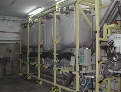 倒袋后物料配套气力输送或管链输送机到指定储料装置(用料点)