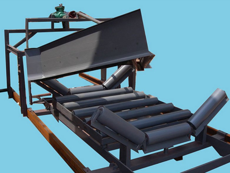 电液动犁式卸料机以电动液压推杆为动力源,工作时,通过推杆伸出作用于驱动杆, 带动框架前进,完成犁刀下落,并支承起平托辊组,使胶带工作面平直,犁刀下沿与胶带面贴合紧密,将运行胶带上的物料卸入漏斗(料斗)中,或卸到需要的场所去。卸料完毕时,启动推杆缩回作用于驱动杆, 带动框架后退,犁刀上抬,可变槽角托辊组由平形变回槽形,使胶带工作面恢复槽形状态,让物料平稳通过;由于电动液压推杆采用液压传动,具有自动过载保护性能。当运行受阻时,油路中压力增高到调定的限额,溢流装置迅速而准确地溢流,实行过载保护。电机运转在额定值内,不会烧毁。