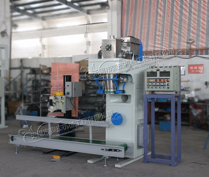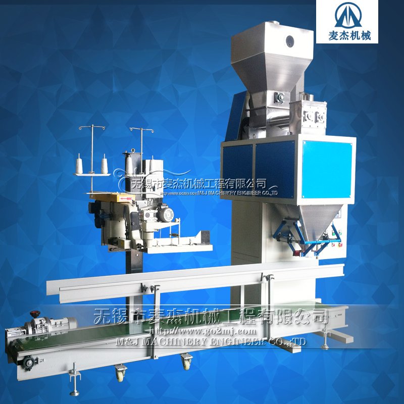 该包装机主要由自动定量包装机(由储料斗、喂料器,称重夹袋斗,揉实机构,电脑控制,气动执行部分等构成)与选配部分(输送机、缝口机/热合机)组成。