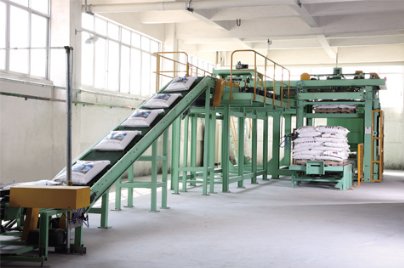 高位码垛机将料袋输送至一定高度后,按照预定方式对料袋进行转位、编组、推袋、分层、码放,将料袋按层码放到托盘上,后将码好的满垛输出。