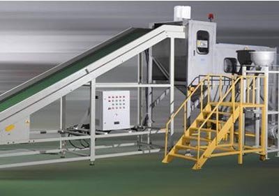 2、物料袋从输送带上滑下,进入切割装置,割刀将物料切成条袋状,将破碎的袋子与里面的物料一起通过溜槽进入筛分装置内。