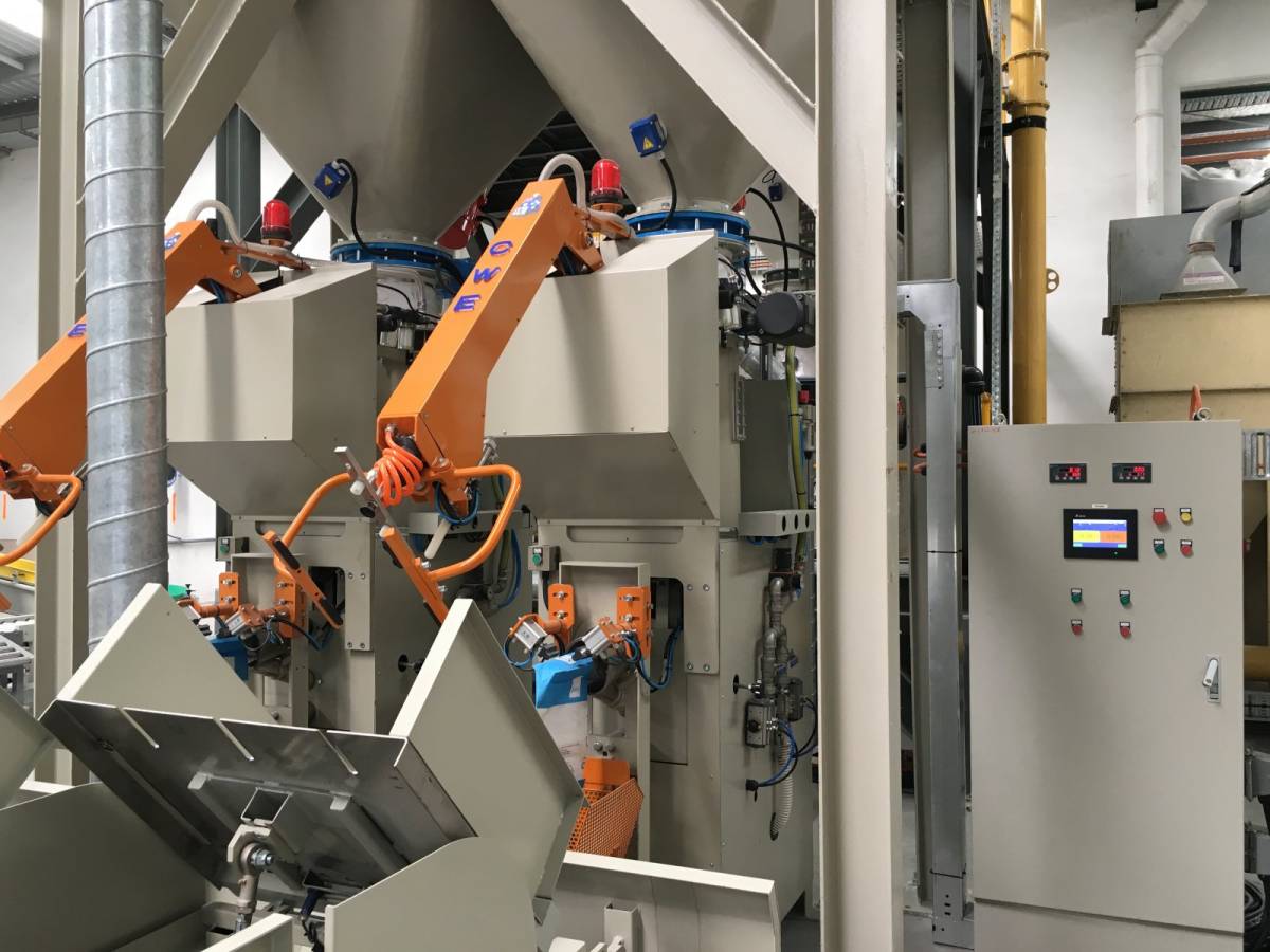 自动套袋机械手:内阀袋由吸盘吸起,开口,然后由机械爪将其套上出料管,当包装机检测到包装袋已经就位后,机器才开始灌装。