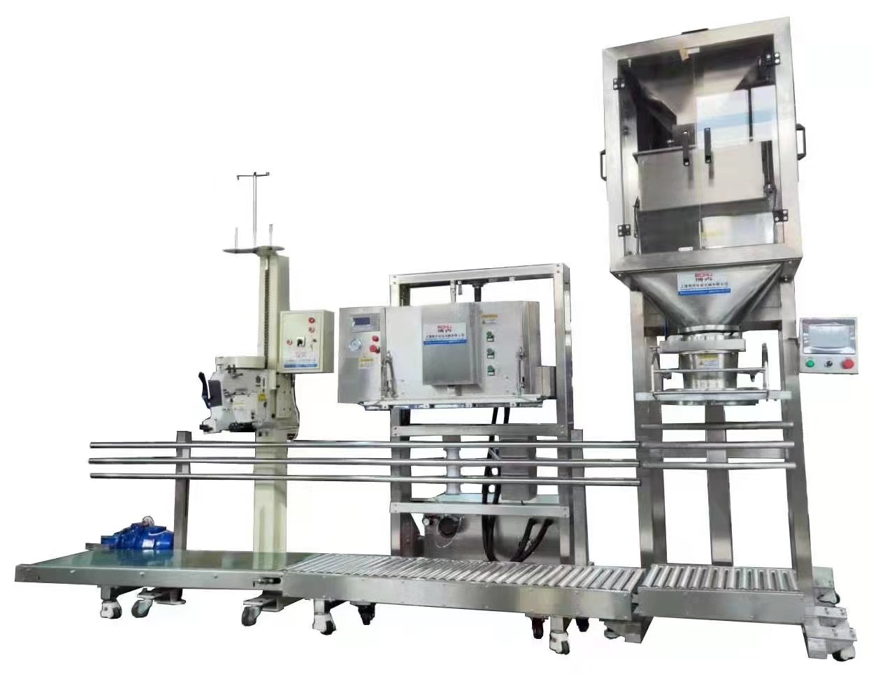 6、工作流程:上料机自动上料→人工手动开袋套住夹袋装置→踩下脚踏开关,夹袋器将袋子夹住→设备自动去皮(自动给料直到到达*终数值)→再踩下脚踏开关,夹袋器松开(也可调至计量充填完成自动松袋模式)→人工把袋子滑送到热封口处(袋子下方有无动力滚筒)、踩下热封口机脚踏开关(自抽真空自动热合)→再到下一道工序缝包→缝包机自动启动、缝包机和输送带同步运行→封包完毕机器自动切线→自动倒包整形→整个工作流程完毕。(本机全道工序可由一人操作)。