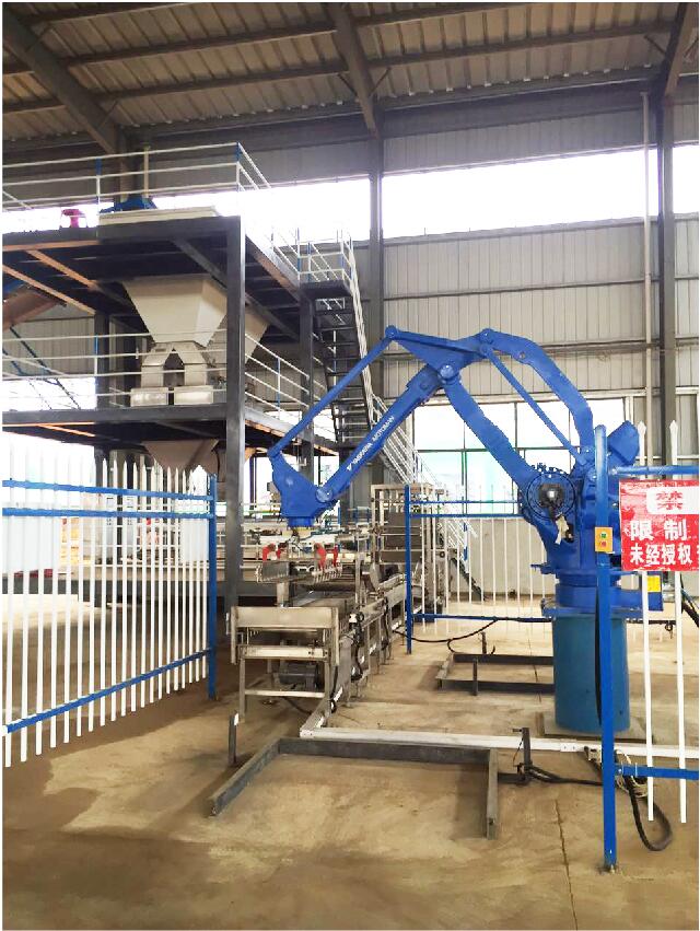 码剁机器人按我们要求的方式堆放在托盘等承载物上,以便叉车机械化运输和仓储堆存。用机器人码垛系统为成品包装中效率高、效益好的解决方案之一,可以极大地提高包装效率,提高生产能力,同时也是可靠性很高的作业方式。典型应用:25-50kg化肥(如:复合肥、有机肥、磷铵、尿素等)、50kg粮食、饲料等。