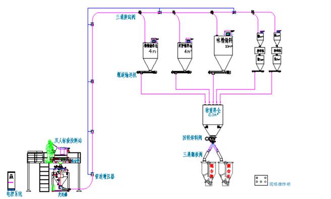 DMP 的配料系统主要构成部分为:原料储料仓、单螺旋或双螺旋给料机、星型旋转给料阀、封闭式电磁振动给料机、高精度流量控制加料阀组、四方型或圆锥型计量斗、高扭矩封闭型放料门及 PLC 电控部分等组成。