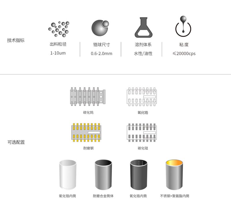 设备外形简单,结构紧凑,操作简单便捷,所有与物料接触的材质均采用高质量耐磨材质,使用寿命长,确保白色不变色。进口机械密封技术,不堵料漏料。升级版棒销式研磨结构,高配版动力系统,动力足,转速高,运行稳定,能使用更小的锆珠,**技术的动态筛网系统,产品粒径分布窄,筛网过流面积大,研磨效率高,大流量不堵塞,适用于中低粘度的浆料,是高端油漆、涂料、油墨研磨的**理想选择。