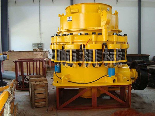 圆锥破碎机其结构主要有机架、水平轴、动锥体、平衡轮、偏心套、上破碎壁(固定锥)、下破碎壁(动锥)、液力偶合器、润滑系统、液压系统。
