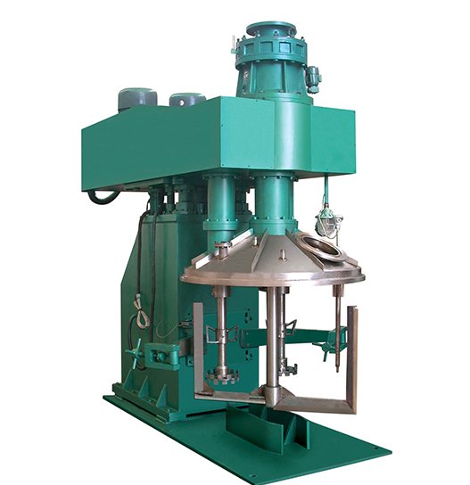 高速轴:蝴碟形搅拌器二个, 叶轮式分散盘各一个(两轴对称) 低速轴:框带柔性刮刀片搅拌器一个 |