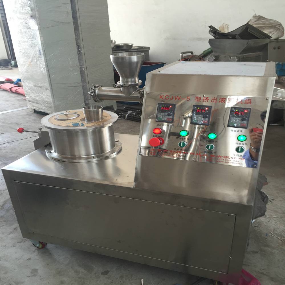 本机是通过设置旋转离心盘、鼓风机、气动喷枪,将湿颗粒制成美丽的球丸。将前道工序做成的湿颗粒投入旋转离心盘内,启动鼓风机后再将旋转离心盘启动,使湿颗粒受到环隙空气浮力、旋转离心力、自身重力作用,呈环周绳股状运动,从而形成真球度极高的球丸。