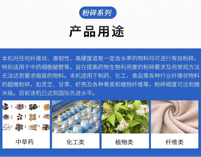 本机WFM型超微粉碎机对任何纤维状、高韧性、高硬度或有一定含水率的物料均可进行有效粉碎,特别适用于中药细胞破壁等,旨在提高药物生物利用度的粉碎要求及用常规方法无法达到要求细度的物料。本机适用于制药、化工、食品等各种行业纤维状物料的超微粉碎,如灵芝、甘草、虾壳及各种骨类和植物纤维等,粉碎细度可达到微米级。目前该机已达到国际**。