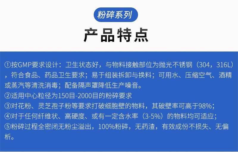 中药细胞破壁加工(脱水蔬菜WFM型超微粉碎机,是按照国家“GMP”要求设计制造,该机具有技术性稳定,耗电省效率高,外观美,使用灵活,操作简单,占地面积小,使用范围广等特点。