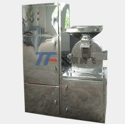 本粉碎机组由粉碎机和物料收集箱、吸尘器组成。解决了物料在粉碎过程中粉尘飞扬。本机的工作原理是物料进入粉碎室,在高速旋转的活动盘于固定盘间受齿的冲击、剪切、摩擦及物料间的相互撞击的作用下被粉碎、经筛网筛选后即成为所需的粉料。本粉碎机组的粉碎机、物料收集箱和吸尘器、全部采用不锈钢材料制作。符合药品生产的”GMP”的要求。