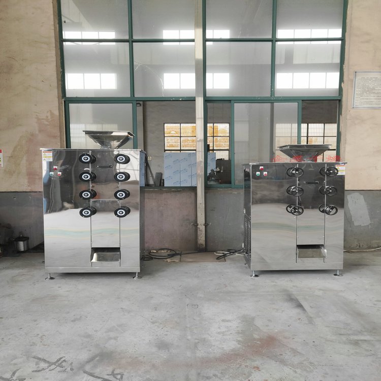 UFJ系列对辊式粉碎机 UFJ系列五谷杂粮粉碎机,专门针对于油性物料的粉碎(如芝麻、花生、杏仁、可可豆、咖啡豆、油菜籽等),该机械由于剪切撞击原理所以对各种状态物料均可粉碎。 该机械按国家GMP管理规范设计,主材采用不锈钢,造形美观大方,移动灵活轻便、低耗量、高产量、噪声低、操作方便。该机是我公司通过精心设计研制开发而成,填补了国内油性物料粉碎机的空白。 工作原理 该机由加料斗,夹棍刀,粉碎电机,自动式出料口,密封箱等部分组成,物料由加料斗进入粉碎室,通过高速旋转的夹棍刀进行粉碎,不同的粉碎细度可以通过调节两辊之间的间距来获得。该机具有操作方便,噪音小,产量高等优点,是油性物料粉碎的设备。粉碎好的物料由特制出料轨道流向出料口,该机组符合GMP标准。 特点 技术参数 | |||||