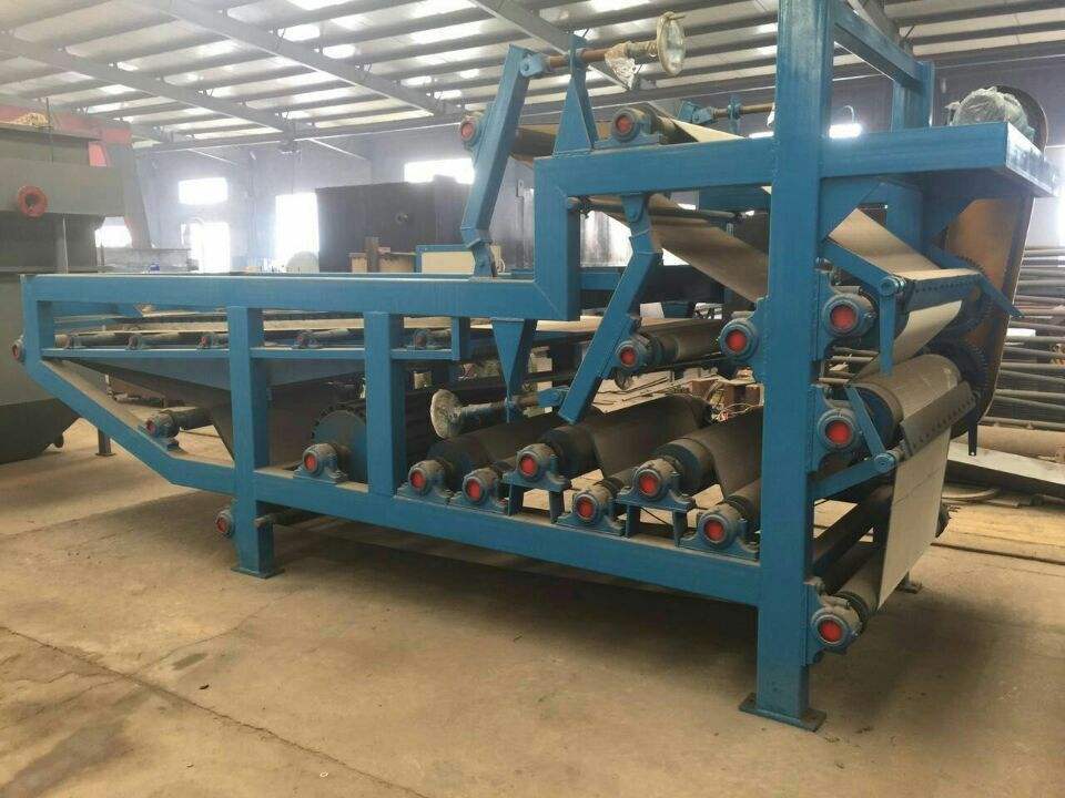 带式压滤机原理:浓缩的污泥与一定尝试的絮凝剂在静、动态混合器中充分混合以后,污泥中的微小固体颗粒聚凝成体积较大的絮状团块,同时分离出自由水,絮凝后的污泥被输送到重力脱水的滤带上,在重力的作用下自由水被分离,形成不滚动状态的污泥,然后夹持在上下两条网带之间,经过楔形预压区,低压区和高压区由小到大的挤压区,剪切力作用下,逐步挤压污泥,以达到**程度的泥、水分离,*后形成滤饼排出。