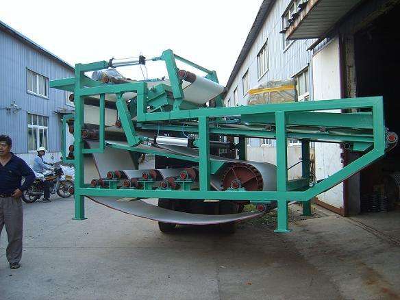 带式压滤机原理:浓缩的污泥与一定尝试的絮凝剂在静、动态混合器中充分混合以后,污泥中的微小固体颗粒聚凝成体积较大的絮状团块,同时分离出自由水,絮凝后的污泥被输送到重力脱水的滤带上,在重力的作用下自由水被分离,形成不滚动状态的污泥,然后夹持在上下两条网带之间,经过楔形预压区,低压区和高压区由小到大的挤压区,剪切力作用下,逐步挤压污泥,以达到**程度的泥、水分离,*后形成滤饼排出。