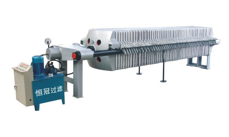 压滤机是利用滤布两边的压力差,迫使物料中的绝大部分水份透过滤布,流出机体外,而物料被阻隔在滤室内形成滤饼,以达到过滤的目的。由于在过滤过程中滤布两边存在着比较大的压力差,提高了过滤速度降低了滤饼的含水,且采用特制滤布,使得滤液纯清,过滤效果比真空过滤机要好得多。