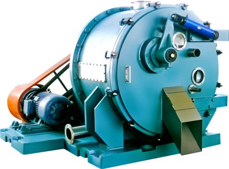 电机带动转鼓达到全速运转后,进料阀门自动开启,悬浮液沿进料管进入转鼓内,其中液相经滤网及转鼓壁滤孔被离心甩出,从机壳上的切向排液口流出,固相物则被截在转鼓内。达到设定的时间后,进料停止,经过给定时间的分离脱水,洗涤阀动作,洗涤液由洗涤管进入转鼓,对滤饼进行洗涤,洗涤结束后继续进行分离,使滤饼达到要求的干燥度,然后卸料,刮刀架旋转,使刮刀切入滤饼层,将滤饼刮下并从料斗中排除。