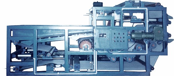 浆料由加料器均匀布在过滤布上,浆料在重力作用下进行脱水、浓缩,经浓缩后的浆料进入S形挤压辊,同进上滤布在浆料进入S形挤压辊后形成挤压力。两条滤带做相向运动并实现固液分离。挤压完成后的滤饼利用改向轮刮刀装置将滤饼从上、下滤布上剥离卸除,下滤布经再生装置洗净后重新回到进料区。滤液经接液盘收集,从而实现不间断的脱水功能。