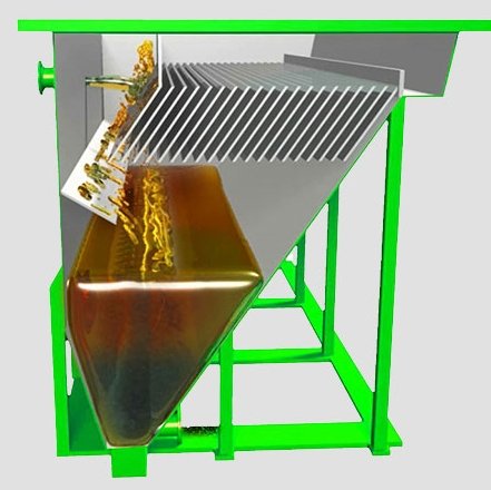 斜板沉降分离器也被叫做斜板澄清器,是一种液体和固体分离设备。当固体和液体的混合物被絮凝处理后或有时不做絮凝处理,进入斜板澄清器的进口槽,并在一组斜板之间向上溢流。固体颗粒落到斜板表面,在重力作用下滑落到污泥收集槽中。澄清的废水通过孔板孔从斜板澄清器的顶部流出。与传统沉淀池相比,斜板沉降分离器更经济,占地面积更少。这些倾斜的板提供了一个较大的有效沉降面积确保有效的固体和液体分离。与离心机相比,斜板沉降器成本更低,维护更方便,且能耗更低。