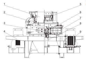1. 进料斗 2.液压启盖 3.检修门 4.机架组件 5.旁路溢料装置 6.深腔转子 7. 破碎腔 8. 轴承箱组件 9.电机组件