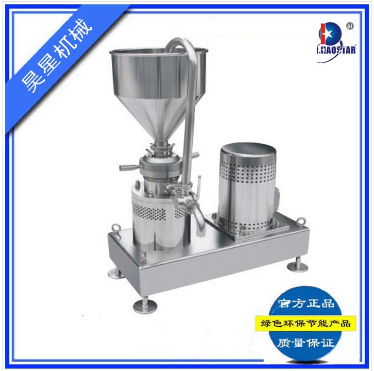 CN.HAOSTAR胶体磨系列可根据用户的特殊要求提供多功能的可空转式运作,机封与介质绝无接触,机械密封使用寿更长的新一代卫生级可空转式胶体磨,,根据胶体磨工作原理及其应用研制1、一种封闭式胶体磨,包括有电机、机体、转轴、静磨体、动磨体及进料斗,其中电机和静磨体固定设在机体上,动磨体固定连接在转轴上,并与静磨体相匹配,其特征在于:所述的进料斗(6)的开口端设置有密封(7),密封盖(7)通过连接件与进料斗(6)的开口端密封配合,密封盖(7)上设置有至少一个视镜(71)。2、根据权利要求1所述的一种封闭式胶体磨,其特征在于:所述的密封盖(7)上设置有至一个回流进料口(72)。3、根据权利要求1所述的一种封闭式胶体磨,其特征在于:所述的进料斗(6)外围上设置有至少一个回流进料口(72)。4、根据权利要求2所述的一种封闭式胶体磨,其特征在于:所述的回流进料口(72)上连接有回流循环管(8),在回流进料口(72)与回流循环管(8)连接的位置设有波纹补偿器(81)。5、根据权利要求3所述的一种封闭式胶体磨,其特征在于:所述的回流进料口(72)上连接有回流循环管(8),在回流进料口(72)与回流循环管(8)连接的部位设置有波纹补偿器(81)。