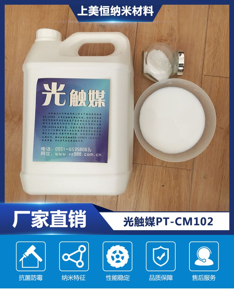 产品概述:光触媒PT-CM102是指这种材料在光照的条件下,能够催化分解室内有害气体,比如甲醛,苯、二甲苯、TVOC等有害有机挥发物,有害物被分解为二氧化碳和水,从而达到净化室内空气的效果。我公司采用先进工艺,将光催化专用的纳米二氧化钛粉体PT-CM101和配套的助剂分散到水性介质中,经过高速快速搅拌,然后经过长时间反复研磨,得到的研磨液体再经过沉降,分液处理,取其精华液,再浓缩,形成高活性,分散均匀,稳定性好的光催化专用的纳米二氧化钛液体。该产品取其精华液,去除粗料,浓度高,活性高,易稀释,不沉淀,透明度高。