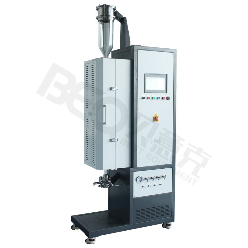 这是一款立式粉体纳米管生长设备。该设备主要分为流化床反应器、三温区加热装置、多路供气系统、以及智能工控操作系统。