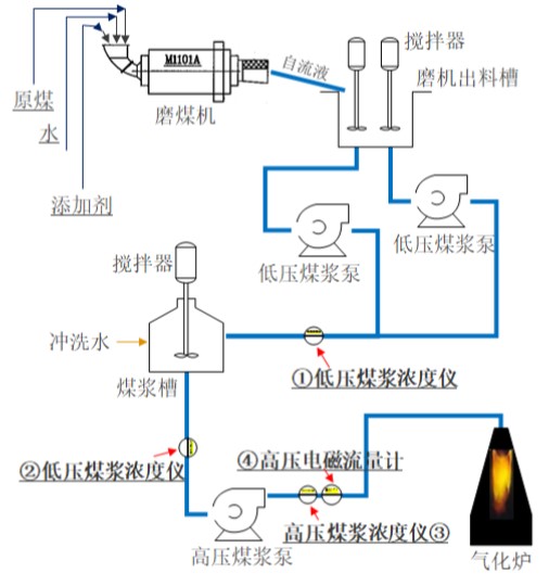 ②安装于高压煤浆泵入口:监测入炉实际煤浆浓度,防止入炉煤浆浓度降低导致安全事故,预测并提前调节氧耗和合成气组分;