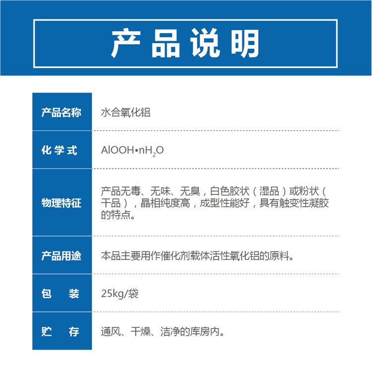 拟薄水铝石别名水合氧化铝,中天利采用醇盐水解工艺,产品纯度高,用作催化剂载体、活性氧化铝原料,也可用作分子筛,硅酸盐耐火纤维制品的成型粘结剂,如作为半合成稀土Y型分子筛裂化催化剂的粘结剂,作为酒精脱水制乙烯催化剂和环氧乙烷催化剂等。