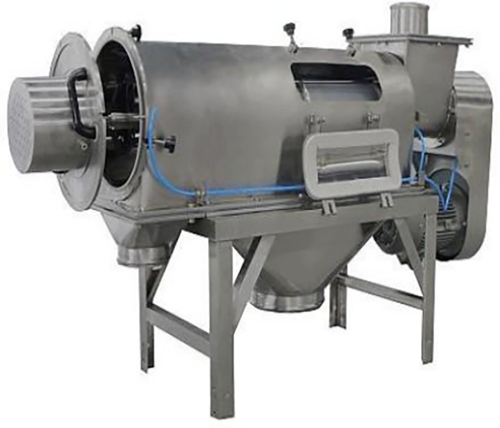物料通过螺旋输送系统后与气流混合、雾化进入网筒内,通过网筒内风轮叶片使物料同时受到离心力和旋风推进力,从而使物料喷射过网,不能过网的物料沿筒壁从粗料排出口排出,以此达到高效分离的目的。