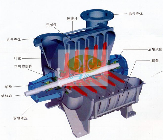 9、冷却:排气轴承座有风冷和水冷两种结构,由于叶轮对气体的逐级压缩,造成排气机壳温度远高于进气机壳。在排气轴承座有风冷和水冷装置,延长了轴承的使用寿命。