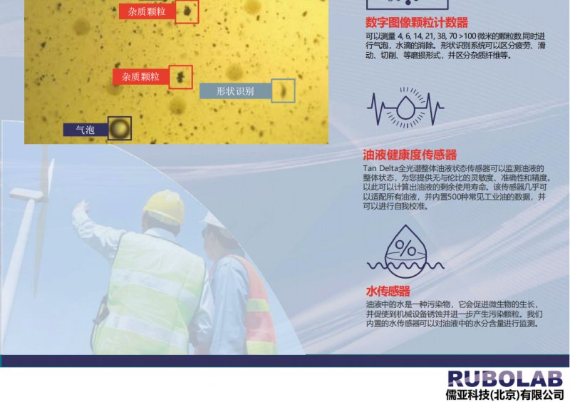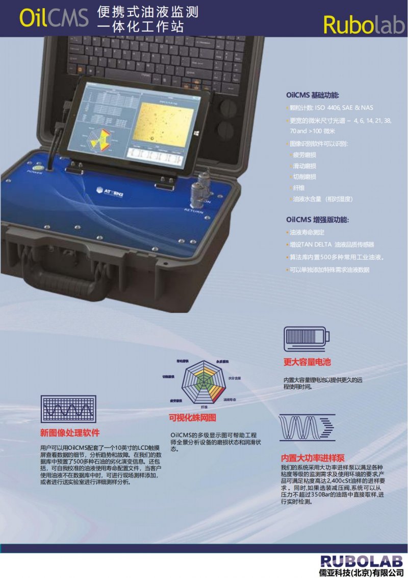 OIilCMS 系列便携式油液综合监测系统采用数字成像智能铁谱技术,全面监测油液中的固体污染颗粒总数及尺寸分布,并对机械磨损颗粒按照 疲劳磨损、滑动磨损及切削磨损进行智能分类,也能有效消除油液中的气泡及水 滴对检测结果造成的影响;同时,内置油液使用寿命及水分检测传感器,全面监 测设备的磨损状态及其润滑状态。