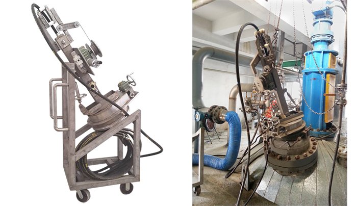 FGCRM-B全自动清釜机为聚氯乙烯糊状树脂反应釜专用清洗机,可以与气控阀安装法兰连接,只需进入一侧法兰孔即可完成清洗,无需穿过人孔。
