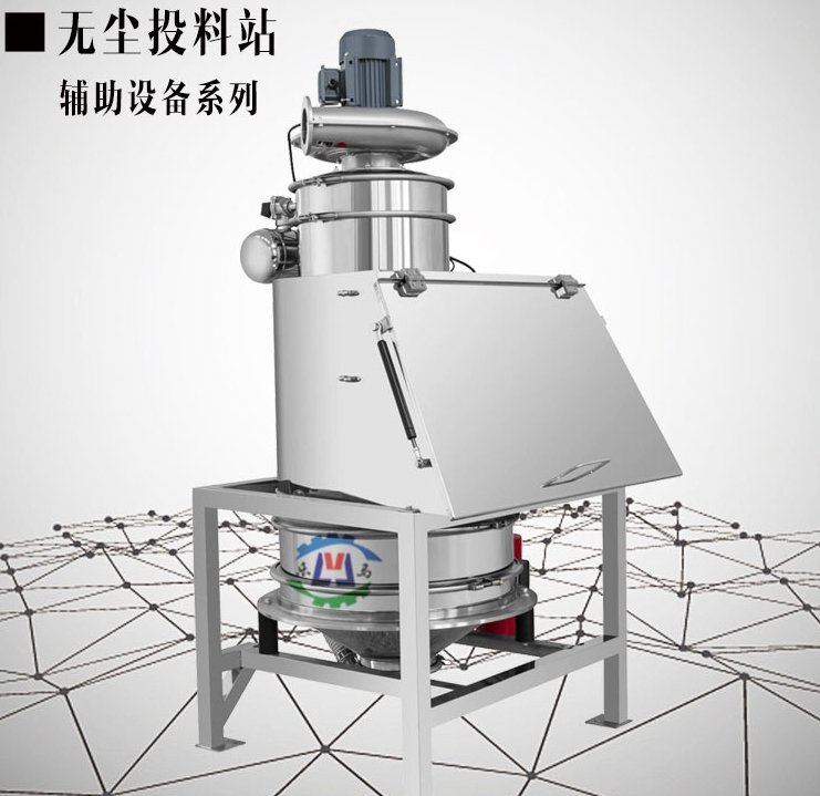 无尘投料站是利用负压集尘的中转装置,适用于中转物料在生产过程中的开袋和投料。能够将物料先储存,后输送,与集尘系统配合使用,有效避免粉尘飞扬。料仓锥形部分配有振动器,有助于物料的流动。可在料仓内安装筛分系统,防止结块物料堵塞下料口及输送管道。根据用户需求而设计,将投料时产生的物料尘粉等和相关设备与人体 进行有效隔离,从而在风机的负压工况下将尘粉吸到过滤系统中,使 气体和物料分离,当物料集聚多时,因自重落入料仓。