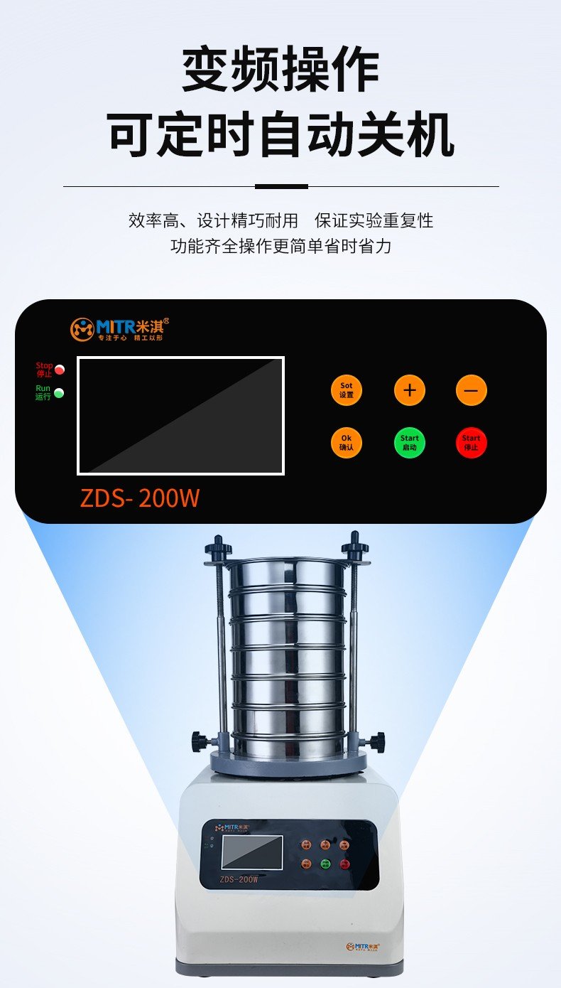 BZS-300标准振动筛机是以振动电机作为振动源的,振动电机振动带动筛机底座振动,再通过底座传导到安放在底座上的标准试验筛上,使小于试验筛筛面网孔的物料颗粒筛分进下层试验筛。