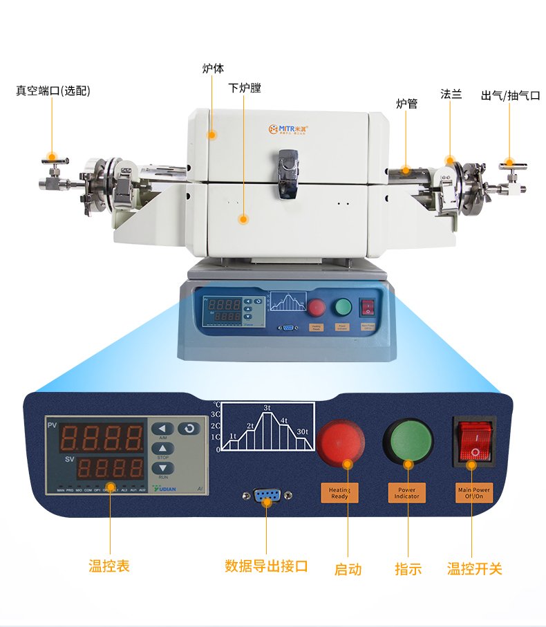 OTF-1200X-25-60、OTF-1200X-50-60是一款小型管式炉,其**工作温度为1200℃,额定功率为1200W。炉管可配置为1" 或2"的高纯石英炉管,炉管两端已安装一对不锈钢法兰(法兰上已安装机械压力表、不锈钢截止阀和宝塔嘴接头)。此款设备允许样品在真空和气体保护下进行烧结。精确温控系统包含了30段升温和降温曲线设置,其控温精度达到+/- 1 °C。