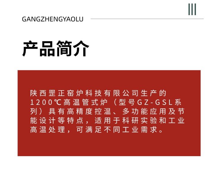 陕西罡正窑炉科技有限公司的 GZ-GSL 1200°C 高温管式炉 是一款专为科研实验和工业高温处理设计的精密设备,核心优势在于精准控温、灵活气氛管理及高效节能。以下从技术特性、应用场景、公司服务及市场竞争力等维度展开说明: