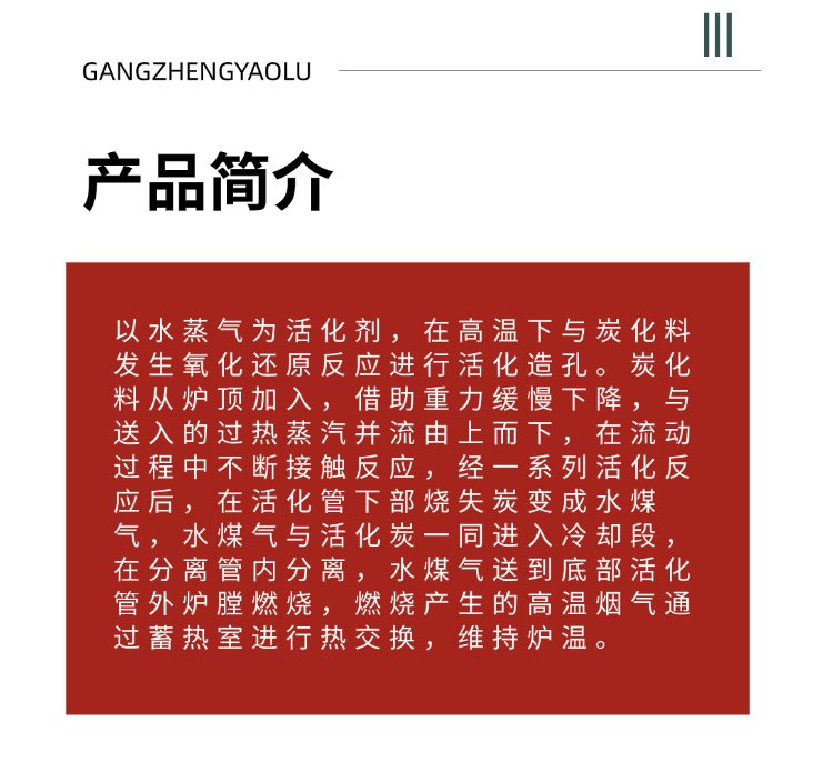 陕西罡正窑炉科技有限公司的GZ-LX 连续式蒸汽活化法回转炉,是一款专为活性炭、多孔碳材料生产设计的高效热工设备,结合了动态煅烧与蒸汽活化技术,广泛应用于新能源、环保、化工等领域。尤其适用于蒸汽活化工艺,可实现规模化、高效化生产。